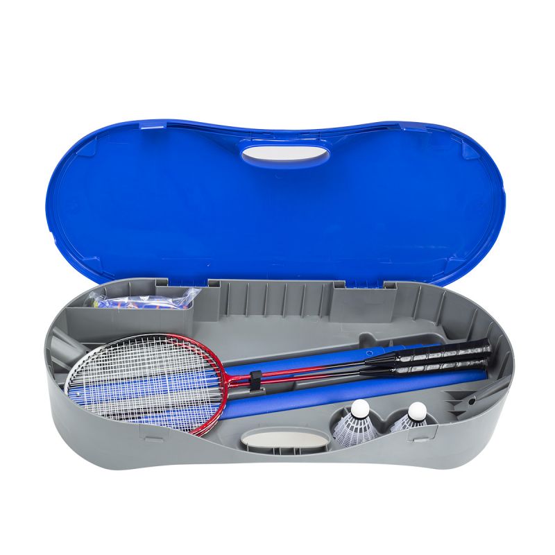 Das Set wird in einer Kunststoffbox geliefert, die gleichzeitig als Netzbasis dient. Die Konstruktion ruht auf zwei Teleskopstangen. Für eine optimale Spannung sollte das Badmintonnetz in einer Höhe von 155 cm, das Tennisnetz in einer Höhe von 96 cm angebracht werden. Der Aufbau des Netzes ist einfach und erfordert kein Werkzeug. Zum Aufklappen des Netzes stecken Sie einfach die Teleskopstangen in die Löcher an der Seite der Box.