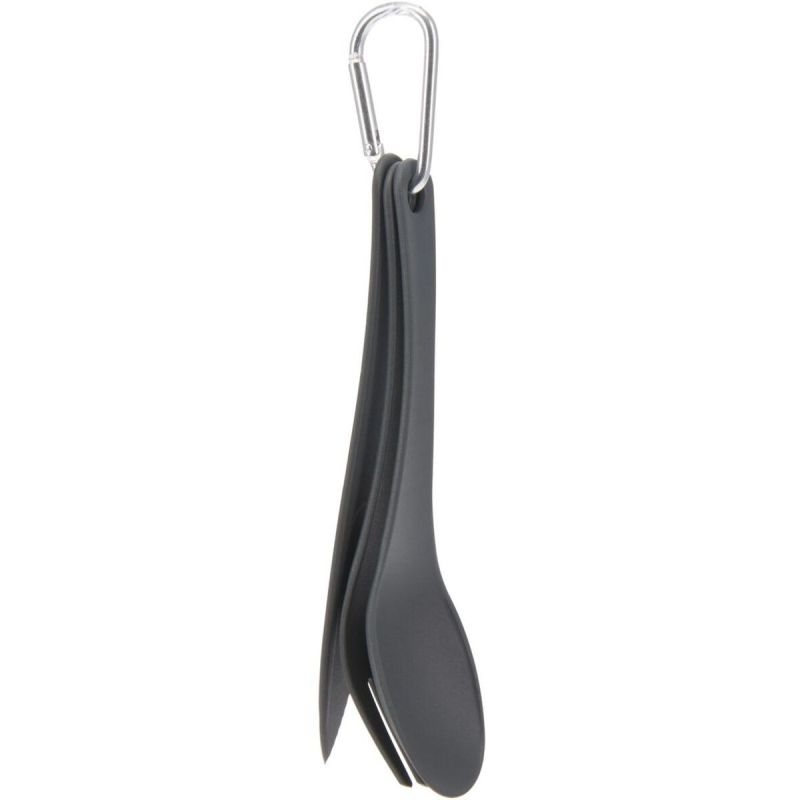 Das Besteck hängt an einem Karabinerhaken mit Öffnung, sodass man es leicht trennen und jedes Teil einzeln verwenden kann.