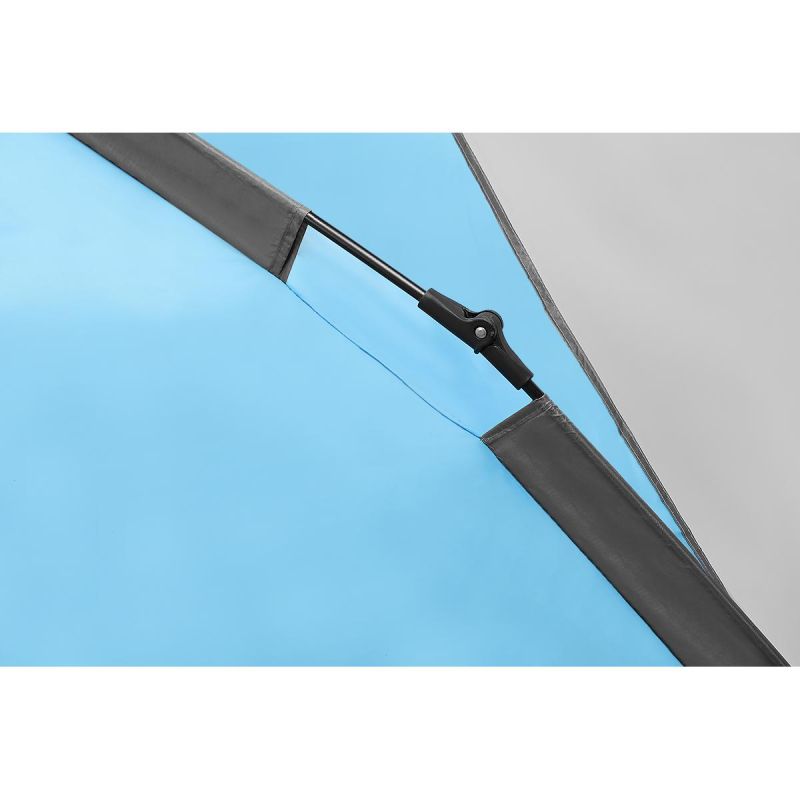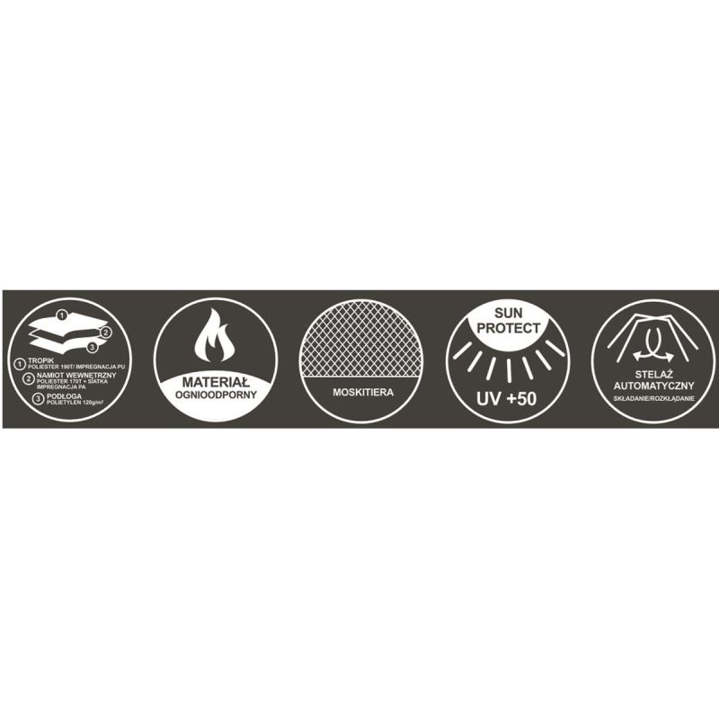 - Material: 190T Polyester-Außenzelt mit PU-Imprägnierung, 170T Polyester-Zeltgewebe mit PA-Imprägnierung + Polyester-Moskitonetz, 120 g/m² Polyethylen-Boden, Fiberglas- und Kunststoffgestänge