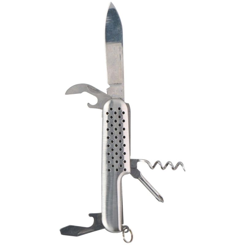 - kann als Messer, Flaschenöffner, Schlitzschraubendreher, Korkenzieher und Dosenöffner verwendet werden.