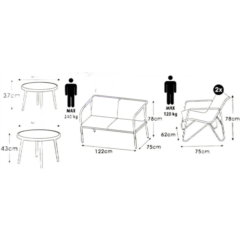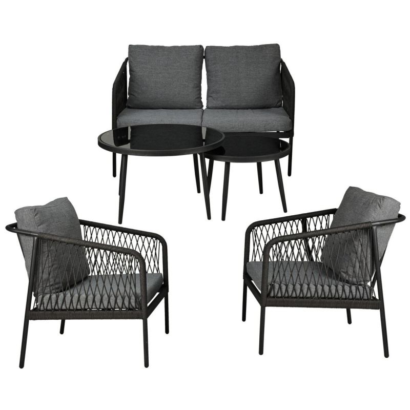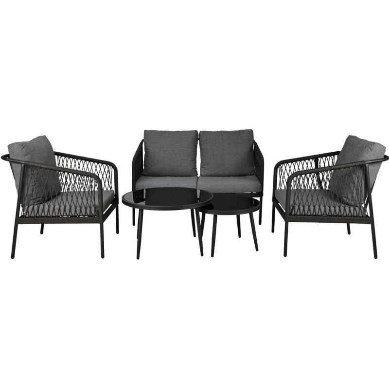 Zwei bequeme Sessel, ein Zweisitzer-Sofa und zwei praktische Tische bilden ein harmonisches und stilvolles Ensemble. Kein Aufbau nötig – Sie erhalten ein fertig montiertes Set, das Ihren Garten verschönert. Perfekt zum Entspannen im Alltag, für Familienfeiern oder laue Sommerabende bei Kerzenschein.