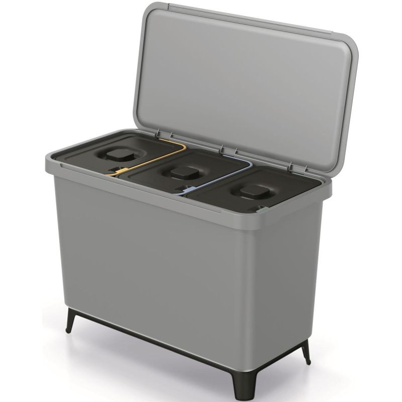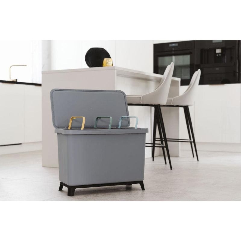 Dieser funktionale Abfalleimer mit drei Einsätzen im Inneren, die jeweils ein Fassungsvermögen von 10 Litern haben, gewährleistet schnellen Zugriff, problemloses Entleeren sowie einfache Reinigung und Sortierung.