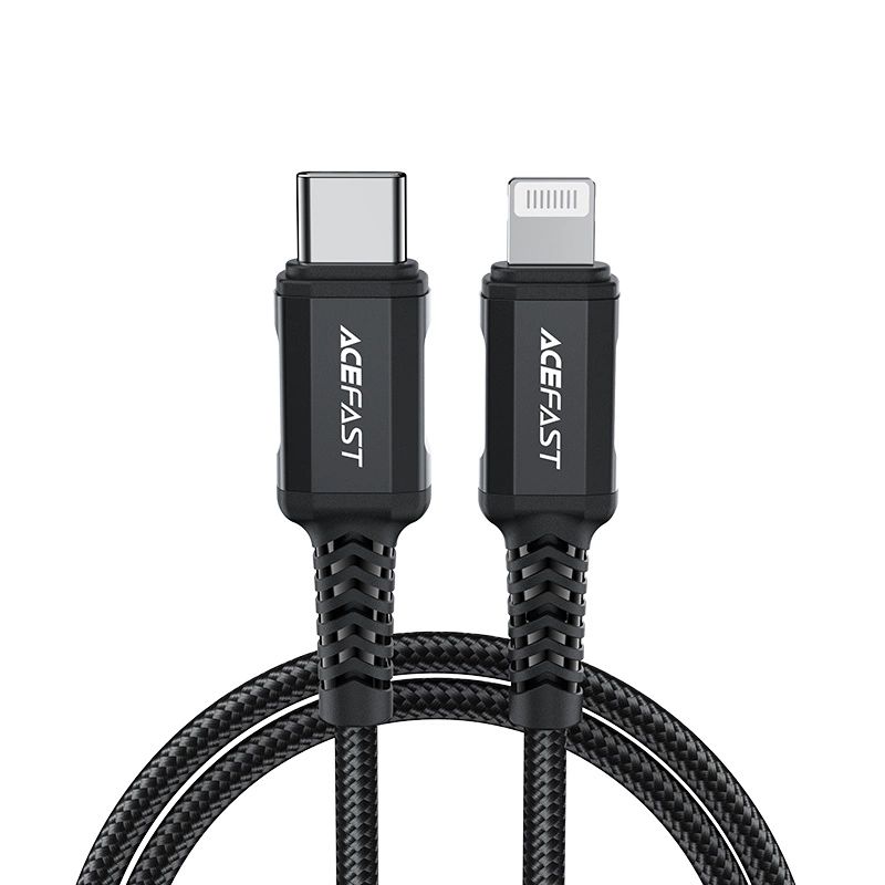 Acefast USB Typ C – Lightning -Kabel zum Laden und zur Datenübertragung. Es ist für Apple Geräte mit Lightning Anschluss gedacht. Es ist 180 cm lang und für den Betrieb mit einer Stromstärke von 30 W und 3 A ausgelegt. Es ist mit der Power Delivery-Schnellladung kompatibel. Es ist MFI-zertifiziert (Maide For iPhone), sodass auf dem Telefon keine Meldung über nicht originales Zubehör angezeigt wird. Das Kabel ist über die gesamte Länge mit Nylon umflochten. Die Stecker haben ein Aluminiumgehäuse. Die Kabelenden sind mit Abdeckungen versehen, um Schäden an den Stellen zu vermeiden, an denen sie am häufigsten gebogen werden.
