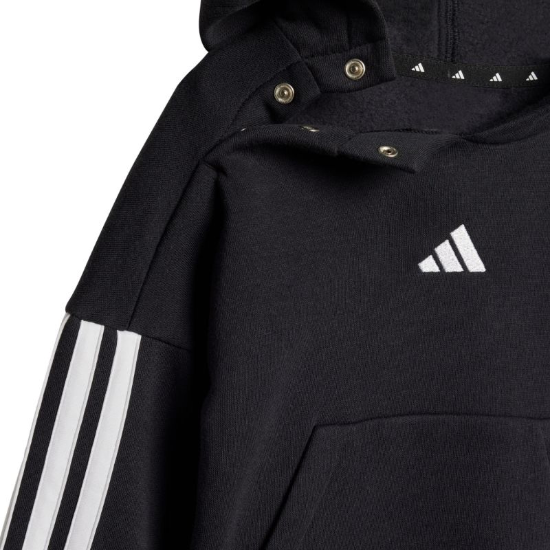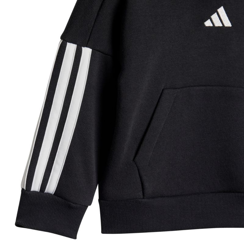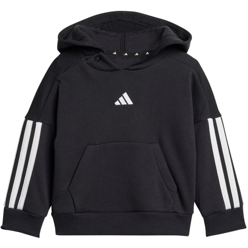 Der adidas Essentials Joggers 3 Stripes Fleece Hoodie JD6484 ist ein Trainingsanzug für Kinder von adidas. Dieser Pullover hat Druckknöpfe bis Größe 86. Gerippte Bündchen an Ärmeln und Saum. Elastischer Bund mit Kordelzug zur Weitenregulierung. Elastische Beinabschlüsse an der Hose. Der Trainingsanzug hat einen klassischen Schnitt. Er besteht aus einem weichen, baumwollreichen Stoff mit Kunstfasern. Innenfutter. Material: 70 % Baumwolle, 30 % recyceltes Polyester.