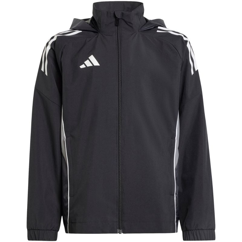 adidas Tiro 25 Competition Allwetterjacke für Kinder, Schwarz IW0448. Diese adidas Tiro Jacke für Kinder ist perfekt fürs Training. Dank des durchgehenden Reißverschlusses lässt sie sich schnell an- und ausziehen. Ein Kinnschutz schützt das Kinn. Die Kapuze ist mit Kordelzügen verstellbar und kann im Kragen verstaut werden. Details: Obermaterial: 100 % recyceltes Polyester, Innenmaterial: 100 % thermoplastisches Polyurethan, normale Passform, Reißverschlusstaschen vorne, Mesh-Futter, verstaubare Kapuze, elastische Bündchen.