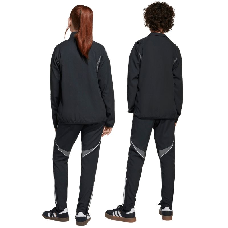 adidas Tiro 25 Competition Präsentationshose für Kinder, Schwarz IW0447. Diese adidas Kinderhose ist perfekt für Training und Erholung. Sie hat eine normale Passform, einen elastischen Bund mit verstellbarem Kordelzug, praktische Seitentaschen mit Reißverschluss und Reißverschlüsse an den Beinen. Hergestellt aus recycelten Fasern, gehört dieses Modell zur Tiro-Kollektion. Die Aeroready-Technologie leitet Feuchtigkeit ab. Die Hose bietet Komfort und einen sportlichen Look beim Training und in der Regenerationsphase. Material: 100 % recyceltes Polyester.
