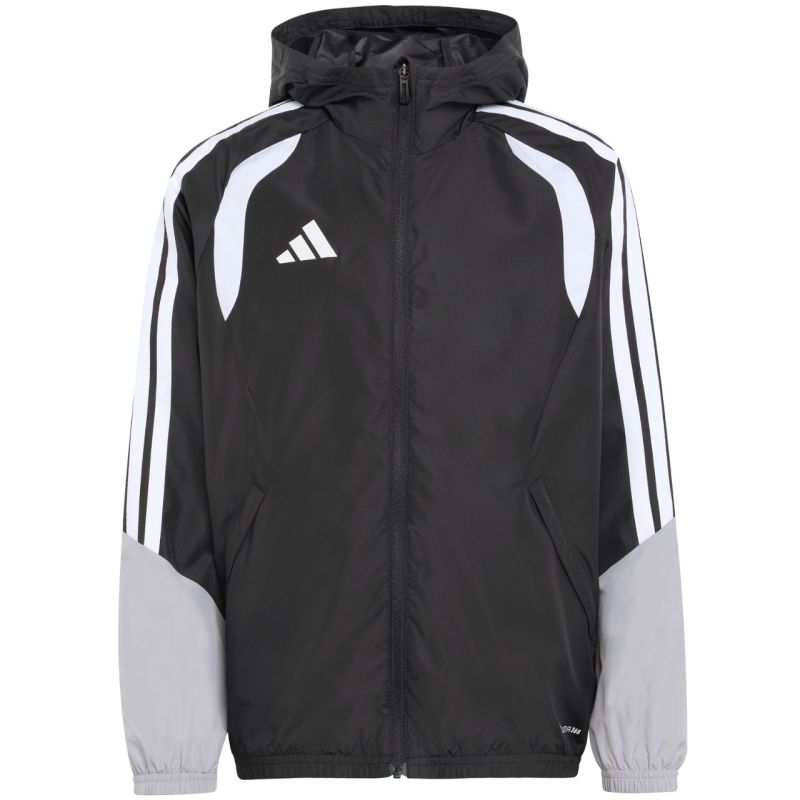 adidas Tiro 26 Competition Allwetterjacke für Kinder, Schwarz KB0156. Diese adidas Tiro Jacke für Kinder ist perfekt fürs Training. Dank des durchgehenden Reißverschlusses lässt sie sich schnell an- und ausziehen. Kinnschutz. Feste Kapuze. Wasserabweisend. Winddicht. Spezifikationen: Material: 100 % recyceltes Polyester. Normale Passform. Durchgehender Reißverschluss. CLIMA365-Technologie. Reißverschlusstaschen vorne. Kapuze. Elastische Bündchen an Ärmeln und Saum.