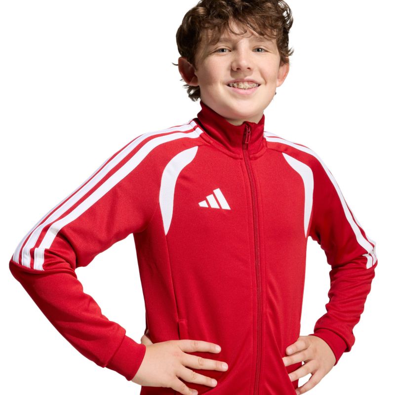 adidas Tiro 26 League Trainingshoodie für Kinder, Rot JY7200. Dieser adidas Fußballhoodie ist perfekt fürs Training. Stehkragen. Durchgehender Reißverschluss. Schmale Passform. Die Climacool-Technologie leitet Schweiß ab. Streifen an den Ärmeln. Dezentes Logo. Schnelltrocknende Fasern. Material: 100 % recyceltes Polyester
