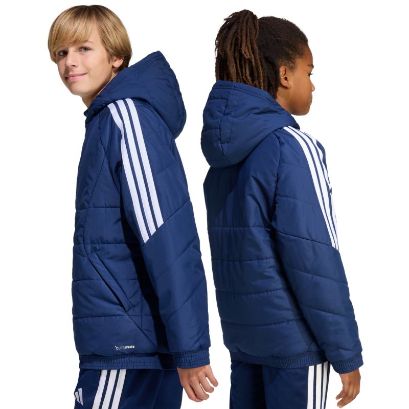 adidas Tiro 26 Winterjacke für Kinder, Marineblau KA8026. Diese adidas Kinderjacke aus der Tiro Fußballkollektion eignet sich auch perfekt für den Alltag. Die gleichmäßig in breiten, horizontalen Einsätzen verteilte Synthetikfüllung sorgt für optimale Körpertemperatur. Klassische Passform. Durchgehender Reißverschluss. Seitliche Reißverschlusstaschen. Elastische Bündchen an Ärmeln und Saum. Feste, nicht verstellbare Kapuze auf hohem Stehkragen. Streifen an den Ärmeln. Dezentes Logo auf der Vorderseite. Climawarm-Technologie. Wasserabweisende Eigenschaften des Obermaterials. Winddichtes Gewebe. Obermaterial: 100 % recyceltes Polyester. Füllung: 100 % recyceltes Polyester.