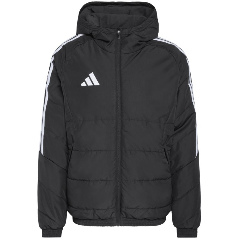 adidas Tiro 26 Winterjacke für Herren, Schwarz JZ4109. Diese adidas Herrenjacke aus der Tiro Fußballkollektion eignet sich auch perfekt für den Alltag. Die synthetische Füllung sorgt für optimale Körpertemperatur. Klassischer Schnitt. Durchgehender Reißverschluss. Seitliche Reißverschlusstaschen. Feste, nicht verstellbare Kapuze auf hohem Stehkragen. Streifen an den Ärmeln. Dezentes Logo auf der Vorderseite. Spezifikationen: Ripstop-Material: 100 % recyceltes Polyester. Normale Passform. Durchgehender Frontreißverschluss. Wasserabweisende Eigenschaften. Climawarm-Isolierung.