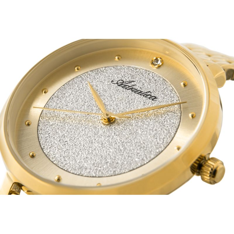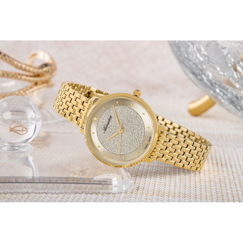 Das zarte, schimmernde Zifferblatt erinnert an eine mit Diamantstaub bestäubte Eisplatte – markant und doch dezent. Ein glatter, satinierter Ring in warmem Goldton umschließt das Zifferblattzentrum und verleiht ihm Ausgewogenheit und Klasse. Goldene Zeiger und kleine Indizes sorgen für eine leichte Eleganz, während ein einzelner Kristall bei 12 Uhr wie ein funkelndes Schmuckelement glänzt – ein Blickfang, aber nicht aufdringlich. Das dezent unterhalb der 12-Uhr-Position platzierte Adriatica-Logo rundet das Design ab. Kleine Details wie das dezente Logo auf der Krone und der Armbandschließe vervollständigen das unverwechselbare Design.