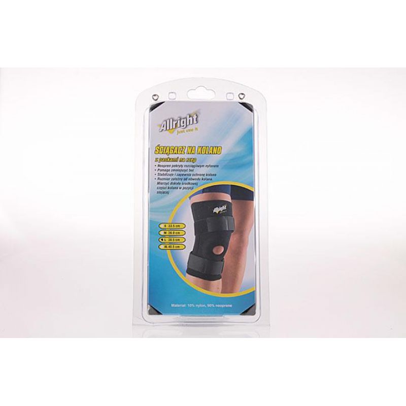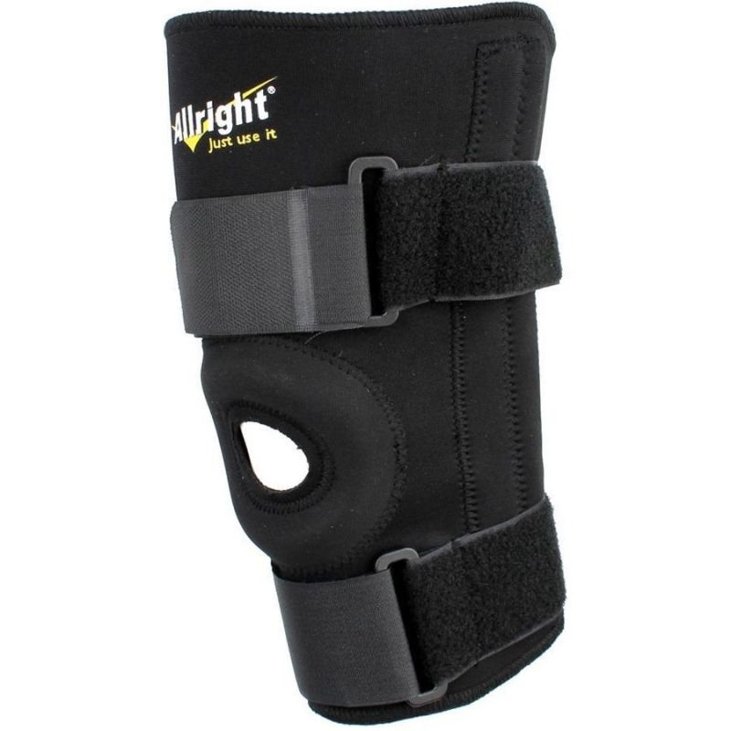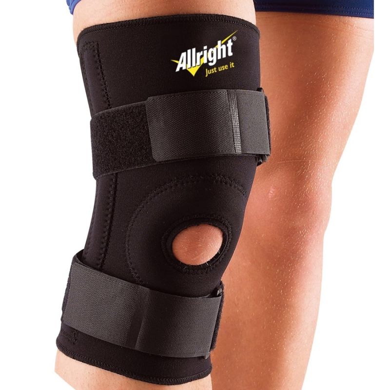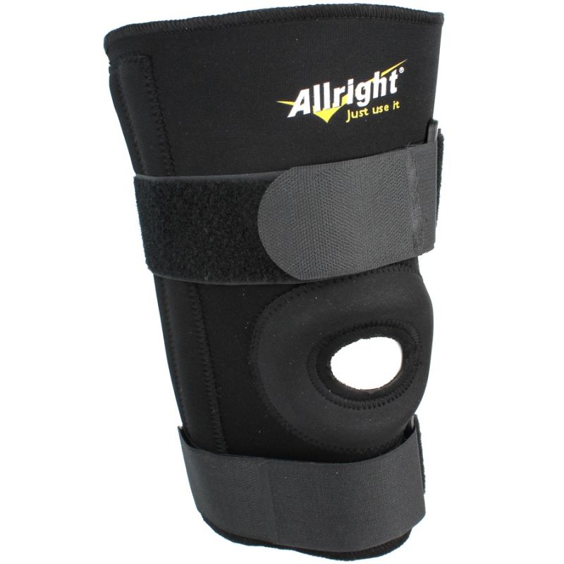 Allright Kniebandage - Größe M. Die Bandage aus Neopren verfügt über zwei elastische Klettverschlüsse für perfekten Sitz. Der ovale Schaumstoff um das Knie sorgt für Komfort und verhindert Wundscheuern. Er schränkt die Bewegung nicht ein und erhält die volle Beweglichkeit des Knies. Dank modernster Technologie hält die Bandage die Körpertemperatur optimal und wärmt Gelenke, Muskeln und Bänder. Die präzise Passform der Bandage reduziert den Druck auf das Kniegelenk und schwellungsbedingte Schmerzen. Diese Bandage eignet sich ideal zur Behandlung von Verletzungen, Schwellungen und Verstauchungen. Sie ist auch wirksam bei posttraumatischen Schmerzsyndromen und rheumatischen Erkrankungen.