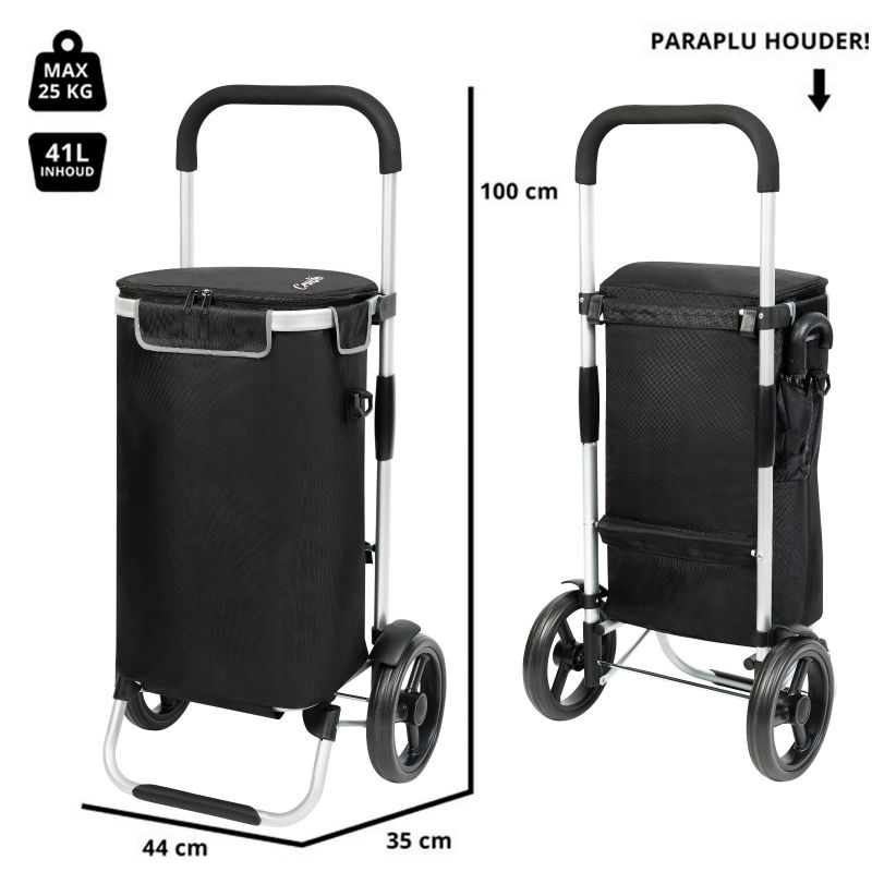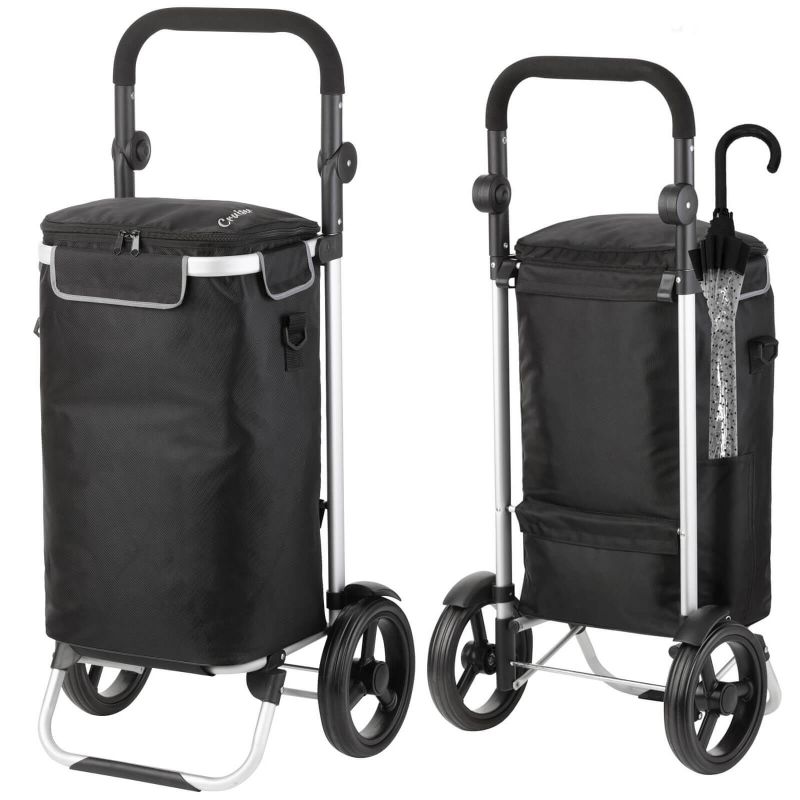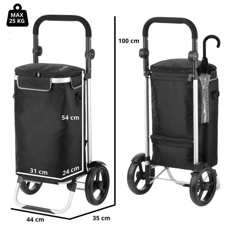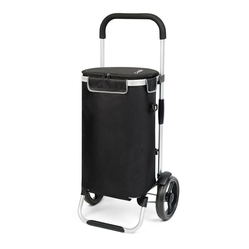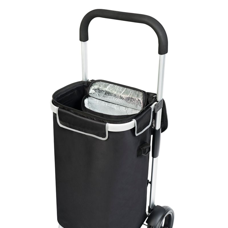 Der Cruiser Allround Trolley hat ein Volumen von 60 Litern. Bis zu 25 kg Lebensmittel finden darin bequem Platz. Zusätzlich ist eine 4 Liter fassende Isoliertasche im Lieferumfang enthalten. So können Sie auch im Sommer längere Einkäufe erledigen, ohne Angst haben zu müssen, dass Ihre Einkäufe bei hohen Temperaturen ihre Eigenschaften verlieren. Sie können den Trolley vom Aluminiumrahmen abnehmen und ihn als klassische Umhängetasche verwenden. Ein Schultergurt ist im Lieferumfang enthalten.