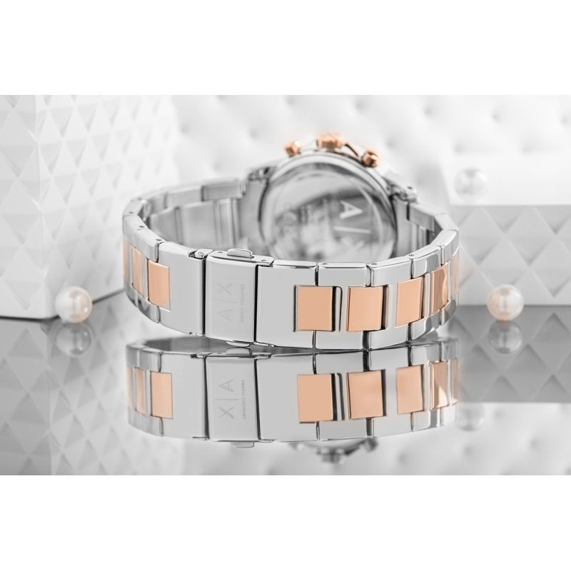 Entdecken Sie, wie ein segmentiertes, zweifarbiges Uhrenarmband Ihren Alltagslooks Charme verleiht! Sein dezentes Design strahlt Eleganz aus und setzt einen Hauch von Finesse, der Blicke auf sich zieht. Gefertigt aus hochwertigem Edelstahl, besticht es nicht nur durch sein Aussehen, sondern garantiert auch Langlebigkeit und Tragekomfort. Dank seiner sinnlichen Form schmiegt sich dieses Armband perfekt an jedes Handgelenk an, umschließt es sanft und unterstreicht seine Weiblichkeit. Das dezente AX Armani Exchange Logo auf der Schließe verleiht ihm eine exklusive Note.