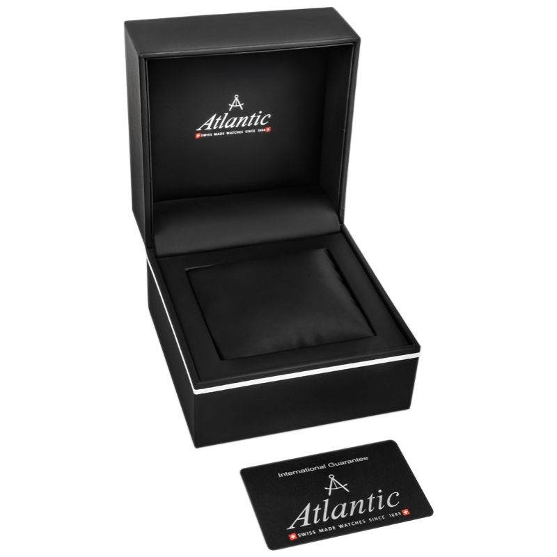 Die Uhr wird in einer eleganten, charakteristischen Atlantic-Box geliefert, die das Prestige der Marke perfekt unterstreicht und der Uhr einen einzigartigen Charakter verleiht. Diese Verpackung macht die Uhr im Handumdrehen zu einem luxuriösen Geschenk, das dem Beschenkten garantiert Freude bereitet.