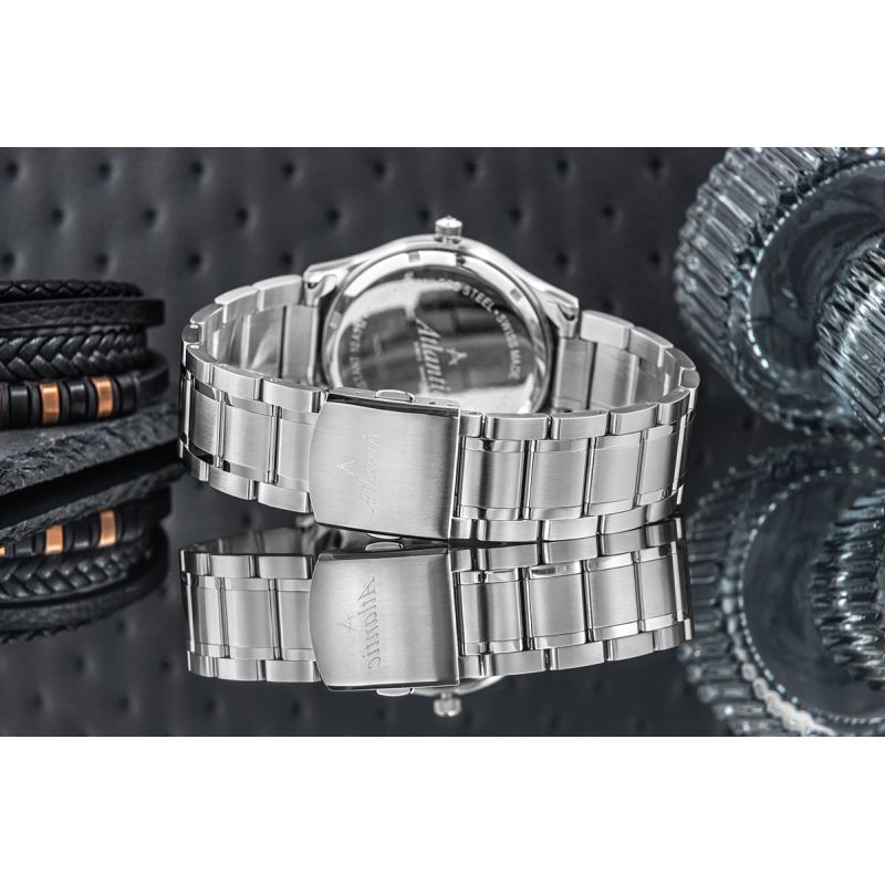 Das Atlantic-Uhrenarmband vereint Eleganz und Langlebigkeit in perfekter Harmonie. Gefertigt aus hochwertigem Edelstahl, besticht es durch seinen dezenten und zeitlosen Charakter. Die präzisen Glieder sind so gestaltet, dass sie perfekt am Handgelenk sitzen und so nicht nur eine ansprechende Optik, sondern auch höchsten Tragekomfort den ganzen Tag über gewährleisten. Eine robuste Schließe garantiert Sicherheit und ein sicheres Gefühl in jeder Situation, während die edle Verarbeitung dem Armband eine klassische Note verleiht. Dieses Armband unterstreicht nicht nur die Exklusivität Ihrer Uhr, sondern wird auch zu einem unverwechselbaren Element Ihres Stils – zu jedem Anlass.
