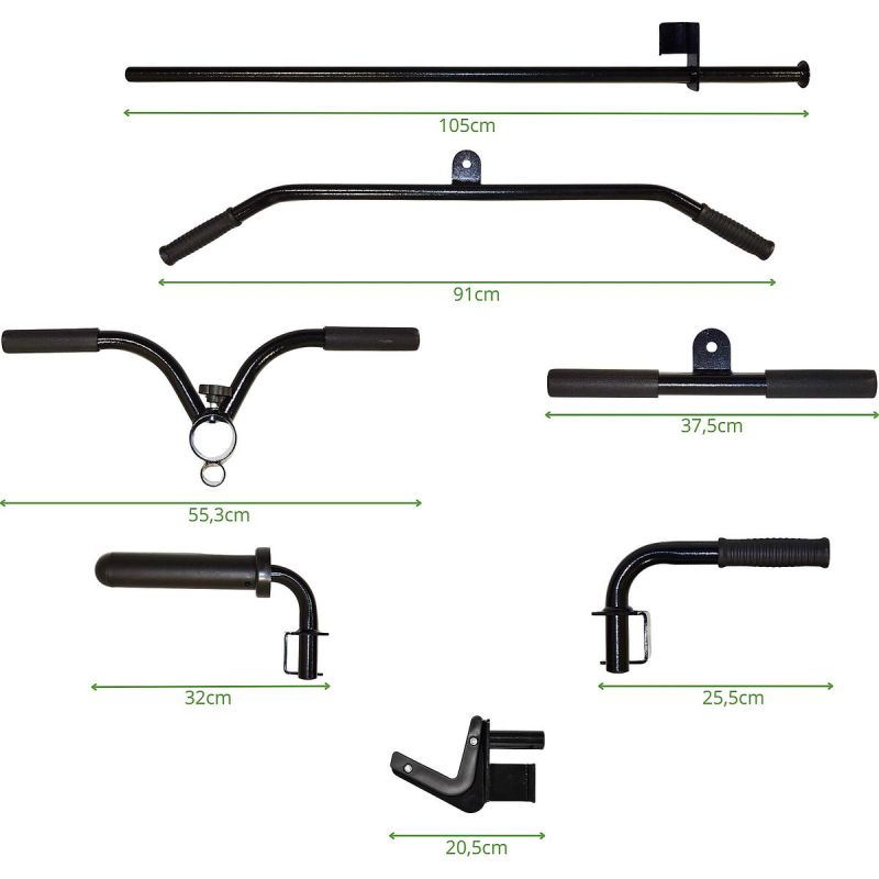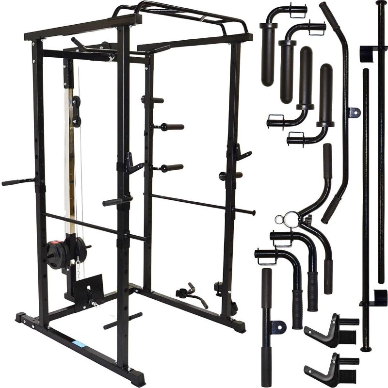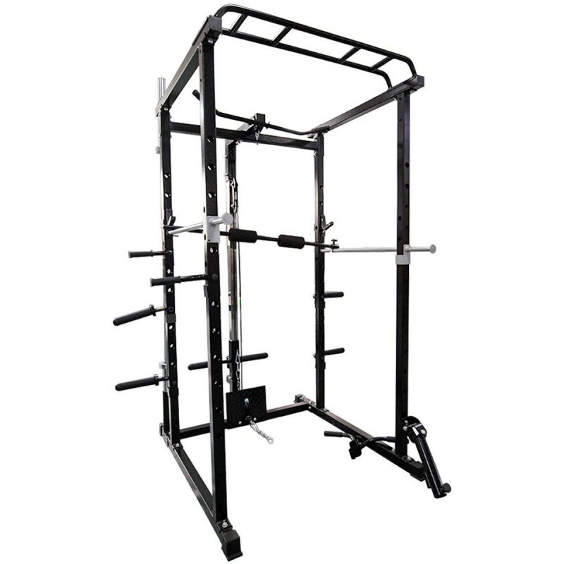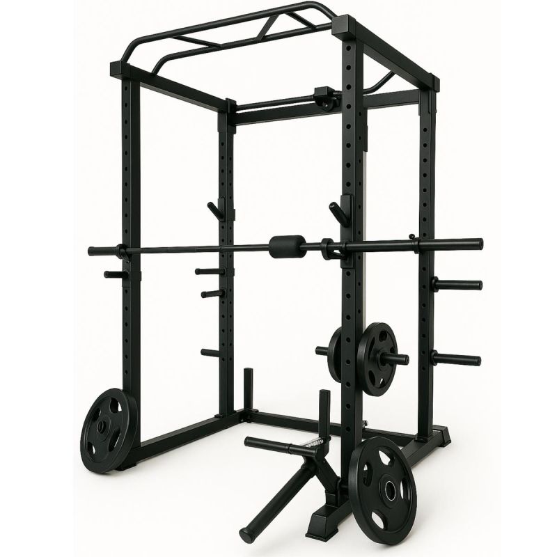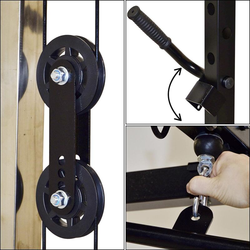 Das Gerät umfasst eine Klimmzugstange, Liegestützgriffe, Hantelablagen und Gewichtsscheibenhalter. Es ermöglicht das Training von Rücken, Brust, Armen, Beinen und Bauchmuskeln an einem einzigen Gerät. Es ersetzt somit mehrere separate Geräte.