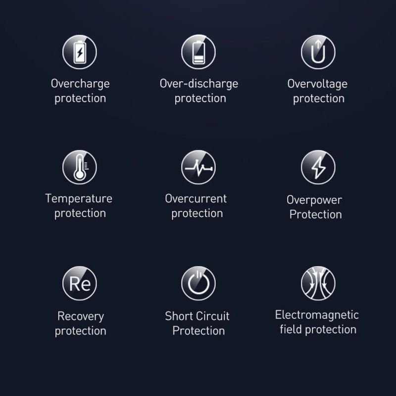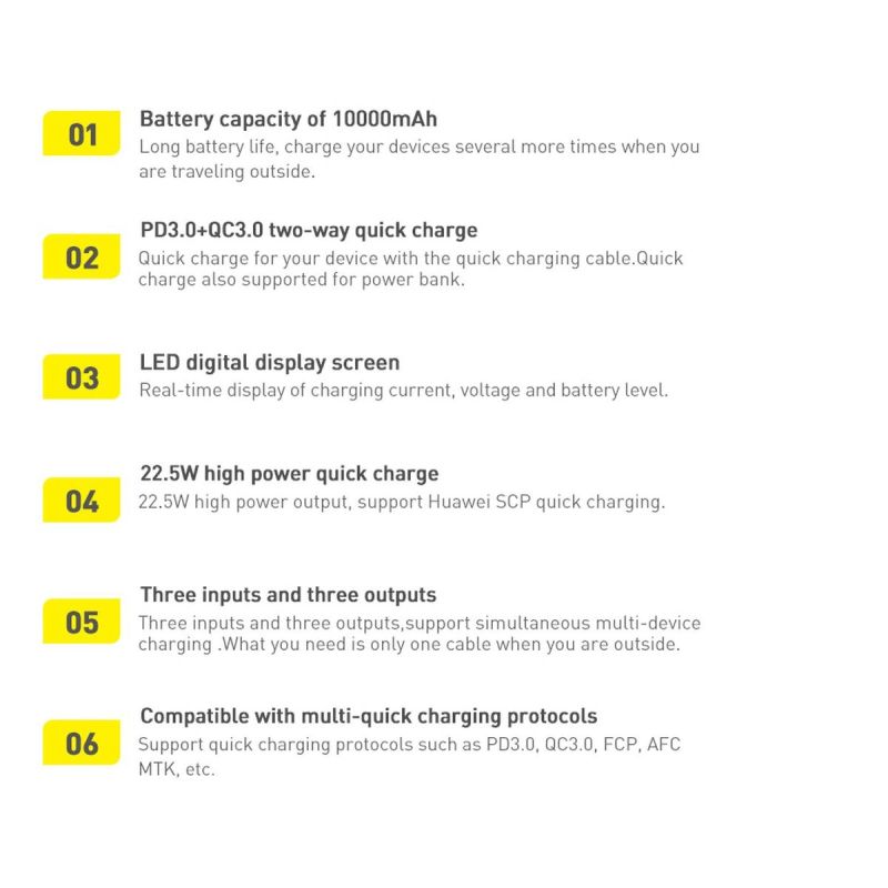 Die Baseus -Powerbank unterstützt viele Schnellladestandards, darunter: SCP, Quick Charge 3.0, Power Delivery 3.0. Es verfügt über 2 integrierte USB-A-Ausgangsanschlüsse, einen USB-C-Eingangs-/Ausgangsanschluss sowie Lightning und Micro-USB-Eingangsanschlüsse. Das Produkt unterstützt einen maximalen Ausgangsstrom von 22,5 W. Die LED-Anzeige am Gehäuse zeigt den aktuellen Betriebsstrom und den Ladezustand der Batterie an. Der integrierte Schaltkreis unterstützt mehrere Schutzmechanismen, die angeschlossene Geräte vor Schäden schützen.