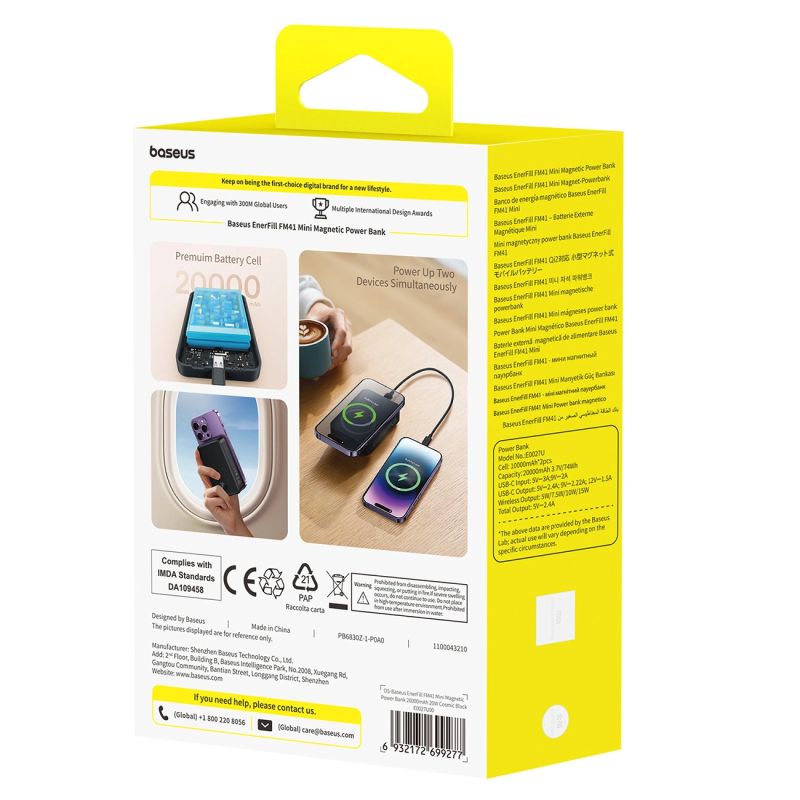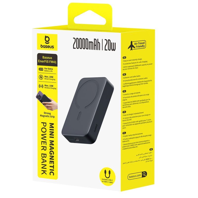 Baseus EnerFill FM41 20000mAh 20W Magnetische Powerbank mit 30cm USB-C-zu-USB-C-Kabel – Schwarz