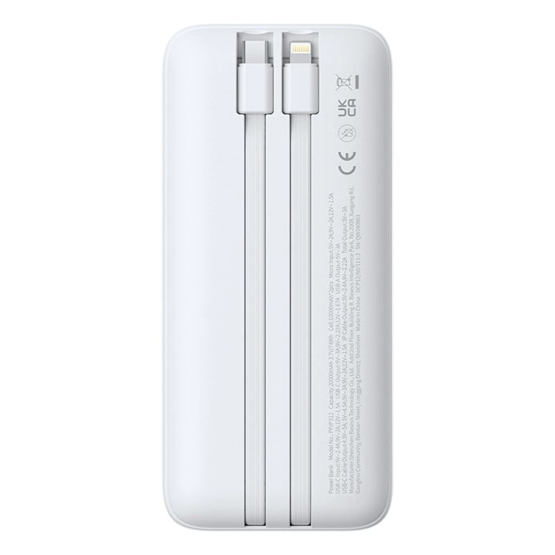 Baseus Lipow 20000mAh 22,5W Powerbank mit zwei integrierten Kabeln – Weiß