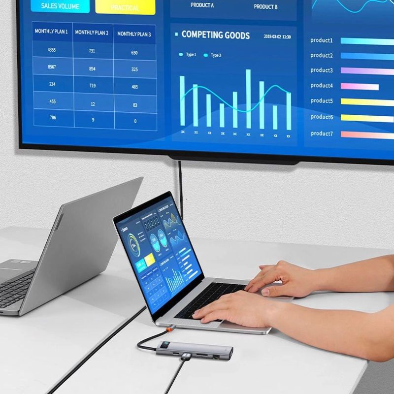 Sehen Sie sich Filme lieber auf der großen Leinwand an? Nichts einfacher! Dank des Gadgets von Baseus können Sie Ihren Fernseher und Laptop ganz einfach verbinden. Alles dank des HDMI-Anschlusses. Bei der Verwendung älterer Geräte ist der VGA-Anschluss des Gadgets eine Annehmlichkeit.