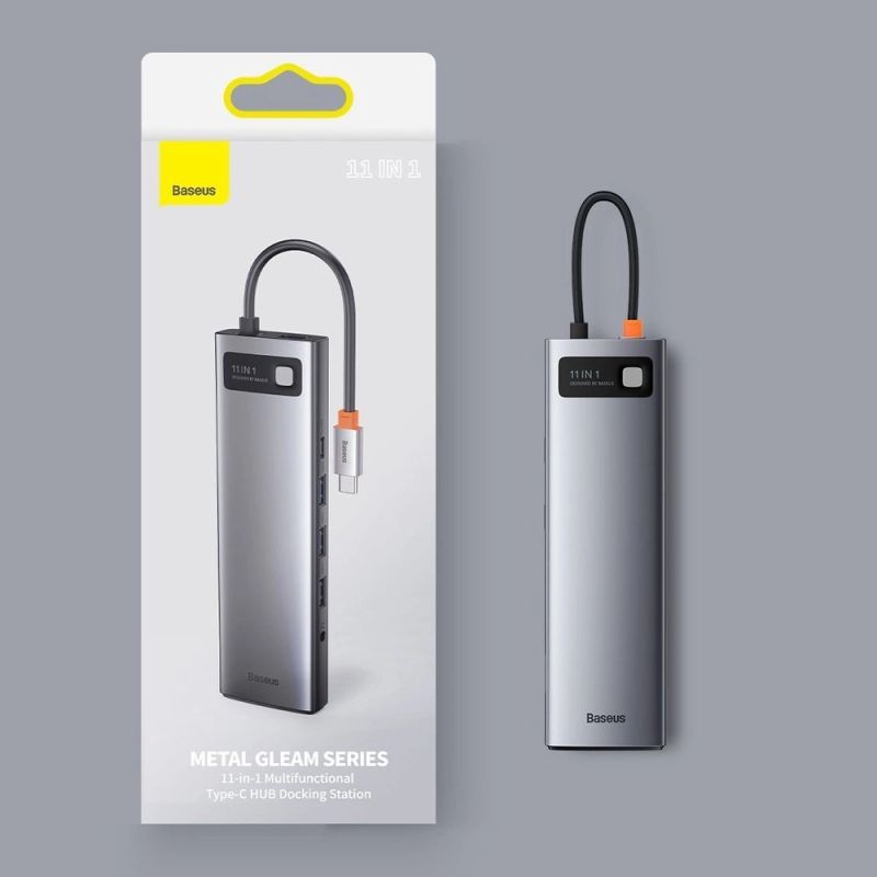 Baseus Metal Gleam 11in1 multifunktionaler USB Type C HUB - 3x USB 3.2 Gen 1 5Gbps / USB Type C PD 100W / 3,5 mm Miniklinke AUX / VGA Full HD 60Hz / 2x HDMI 4K 30Hz / TF- und SD-Kartenleser / RJ45 1Gbps grau (CAHUB -CT0G)
