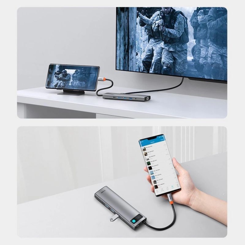 HUB by Baseus steht nicht nur für tolle Qualität, sondern auch für ein interessantes Design, das die Blicke auf sich zieht. Durch die Verfügbarkeit verschiedener Steckdosentypen müssen Sie sich keine Gedanken mehr über den Mangel an freien Plätzen machen. Sie können problemlos verschiedene Arten von Geräten anschließen - Monitor, Fernseher, Speicherkarten und sogar Kopfhörer.