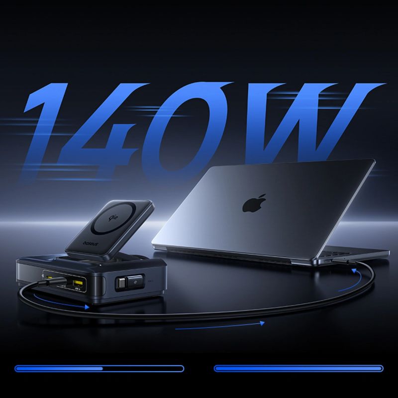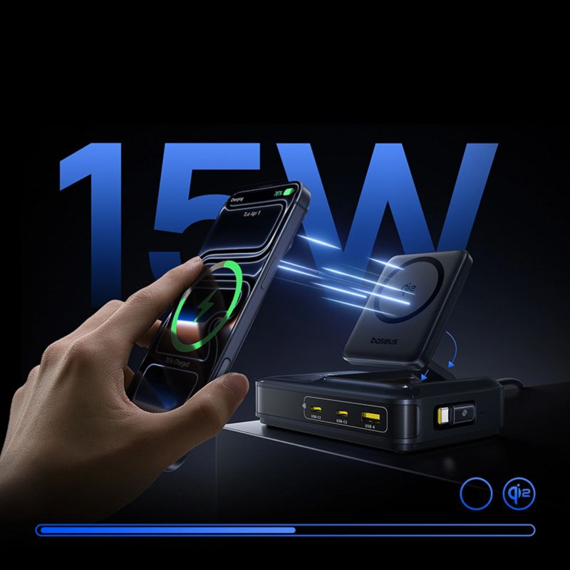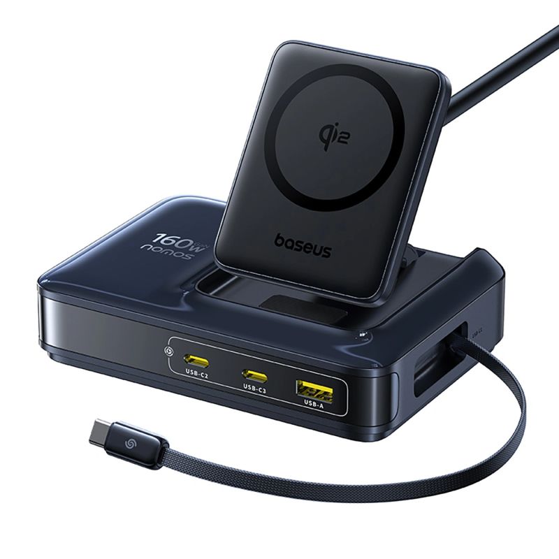 Die Baseus Nomos NH21 ist eine fortschrittliche Ladestation, die mehrere Geräte gleichzeitig effizient und schnell mit Strom versorgt. Mit einer Gesamtleistung von bis zu 160 W können Sie Laptops, Smartphones und andere Geräte ohne Leistungseinbußen aufladen. Das integrierte, einziehbare USB-C-Kabel erhöht den Komfort und macht zusätzliche Kabel überflüssig. Kabelloses Laden mit bis zu 15 W erweitert die Einsatzmöglichkeiten. Das kompakte Design sorgt für einen aufgeräumten Arbeitsplatz. Diese Lösung vereint das Laden mehrerer Geräte an einem Ort.