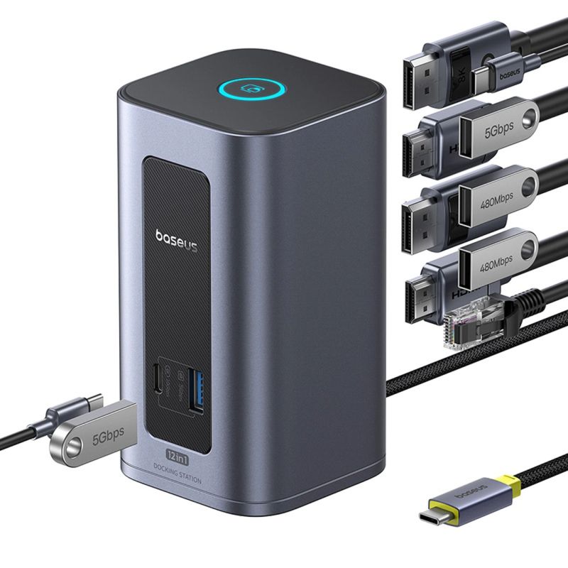 Die Baseus Nomos NU1 Air Spacemate ist eine fortschrittliche 12-in-1-Dockingstation für Laptop- und Computerbenutzer mit höchsten Ansprüchen an Funktionalität. Sie unterstützt mehrere Anschlüsse gleichzeitig, sodass Sie Monitore, Zubehör und ein kabelgebundenes Netzwerk an einem Ort verbinden können. Die Unterstützung mehrerer Displays und schnelle Datenübertragungen mit bis zu 10 Gbit/s steigern die Arbeitseffizienz. Über einen USB-C-Anschluss mit Power Delivery bis zu 100 W können Sie Ihren Laptop gleichzeitig laden, während Sie die Dockingstation nutzen. Die stabile Konstruktion und die durchdachte Anordnung der Anschlüsse erleichtern die Organisation Ihres Arbeitsplatzes. Diese Lösung sorgt für Ordnung und erhöht den Komfort bei der täglichen Nutzung.