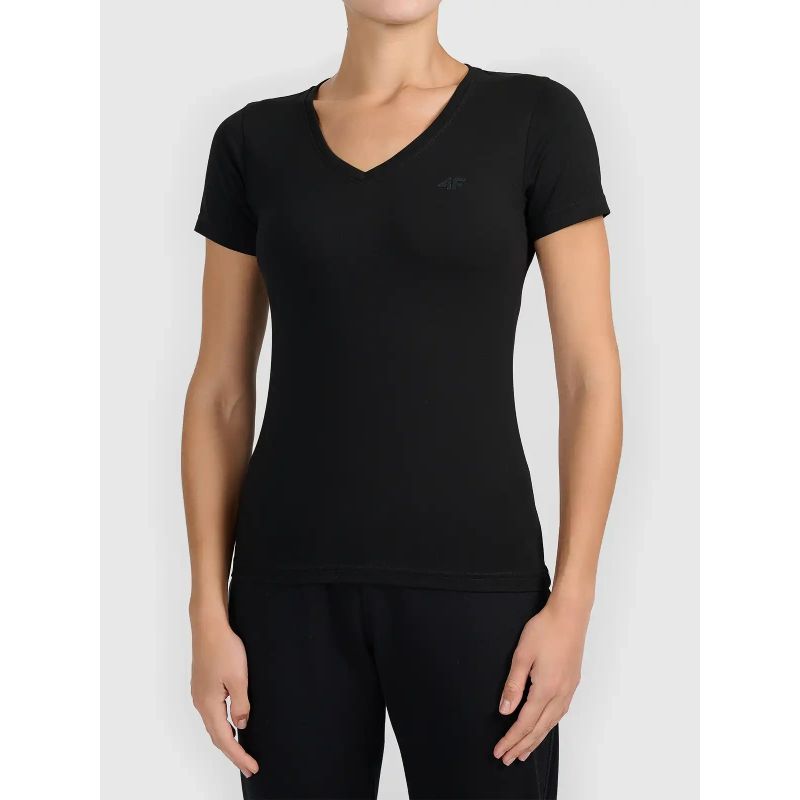 Das 4F Damen-Basic-T-Shirt mit V-Ausschnitt ist ein klassisches Oberteil, das sich ideal für Alltagsoutfits eignet und als Baselayer unter einem Sweatshirt oder einer Jacke getragen werden kann. Sein minimalistisches Design vereint Komfort und Vielseitigkeit und macht es so leicht kombinierbar.