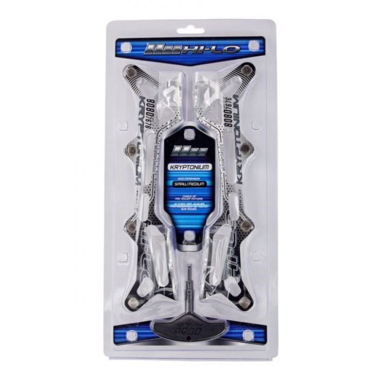 Hi-Lo Kryptonium Roller Hockey – Rahmen/Kufen für professionelle Rollhockeyspieler. Das Design wurde entwickelt, um das Gewicht drastisch zu reduzieren, ohne an Stabilität einzubüßen. Dieses beliebte Hi-Lo-Set bietet zwei Rollengrößen: 80 mm hinten und 76 mm vorne für verbesserte Manövrierfähigkeit, Power und Balance. Für Mission- und Bauer-Skates. Das Set enthält: 2 Rahmen/Kufen, 8 Achsen, 8 608-Unterlegscheiben und 1 Montagewerkzeug. Richtlinien zur Größenbestimmung für Hi-Lo-Schlittschuhe Rahmengröße 2012–2019 / Bauer- oder Mission-Schlittschuhgröße SM–MD / 6,0–9,5 LG / 10,0–12,0 Rahmengröße 2010–2011 / Mission-Schlittschuhgröße SM / 6,0–7,5 MD / 8,0–9,5 LG / 10,0–12 Rahmengröße 2009 und älter / Mission-Schlittschuhgröße SM / 6,0–8,0 MD / 8,5–10,5 LG / 11,0–13,0