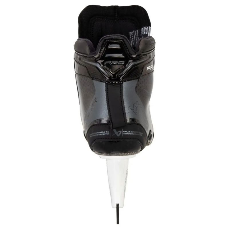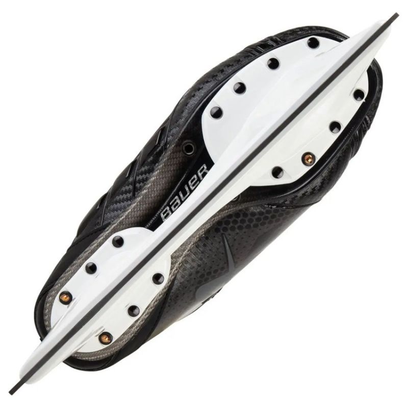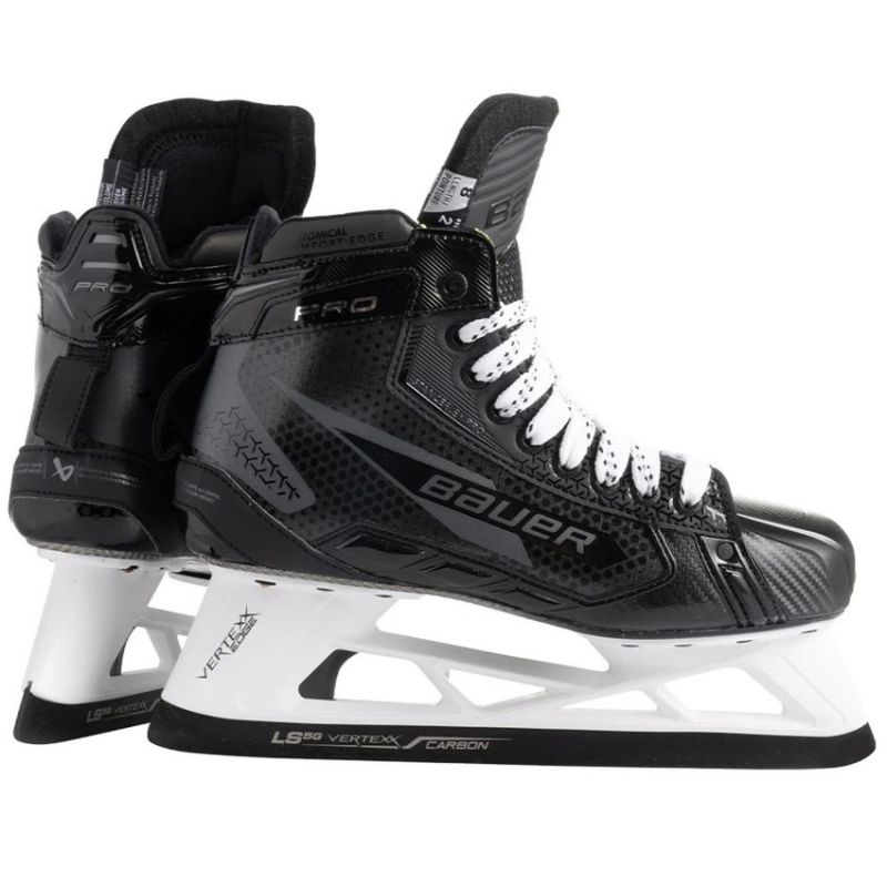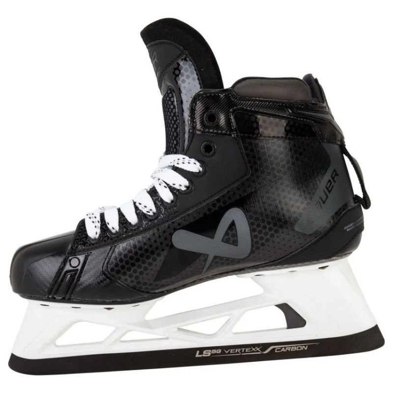 Topmodell des Bauer-Torwartschlittschuhs im Jahr 2012. Der Winkel des Schlittschuhs zur Eisoberfläche wurde um 28 % erhöht. Zusätzliche BAUER ALIVE-Verbundbeschichtungen verstärken den Innenschuh. Verstärkte Seitenwände des Torwartschlittschuhs. Konturierte Zunge des Schlittschuhschuhs. 3 mm auswechselbare, hochfeste Kufe.