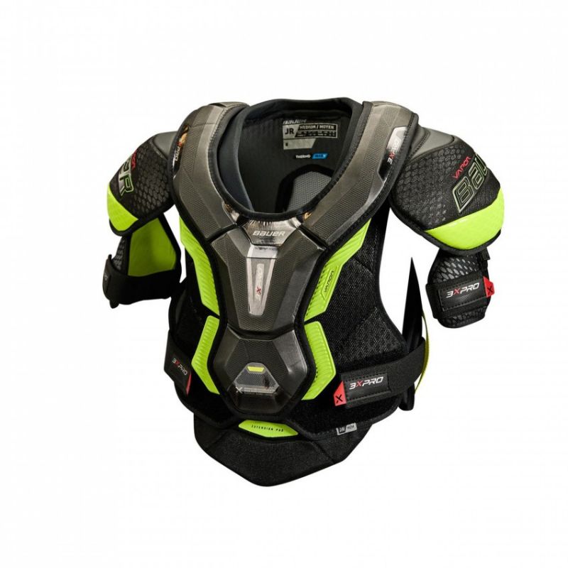 Bauer Vapor 3X Pro Jr Hockey-Schulterpolster. Level: Leistung. Schulterschutz: Geformter, flacher Schild. Brustbeinschutz: Schwimmender Hyperlite HD-Brustbeinschutz mit HD-Schaumstoffeinlagen.