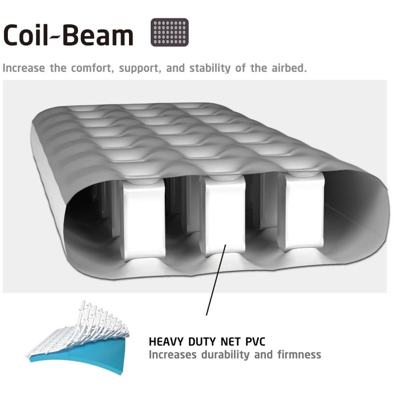 Die Coil-Beam-Konstruktion ist die ideale Lösung für alle, die von einer Luftmatratze nicht nur Komfort, sondern auch Langlebigkeit und Stabilität erwarten. Dank der vertikalen Streben bietet die Matratze hervorragende Unterstützung und Komfort. Perfekt für Reisen, zu Hause, im Garten oder auf dem Grundstück.