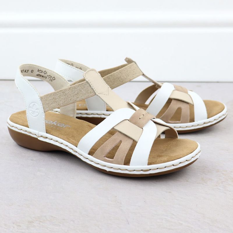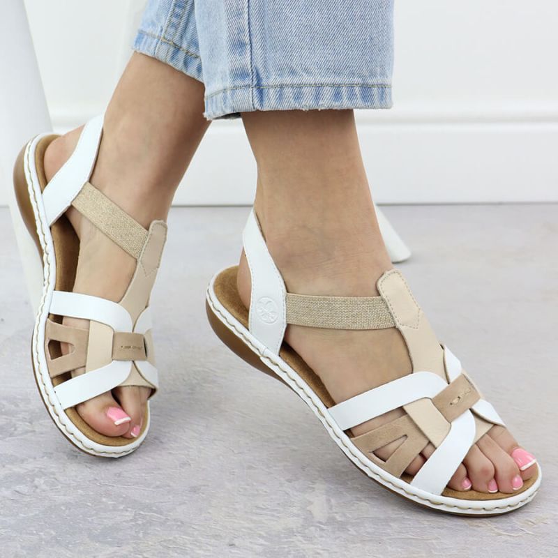 Bequeme Damen-Sandalen zum Hineinschlüpfen mit elastischen Riemen, weiß, Rieker 65918-81