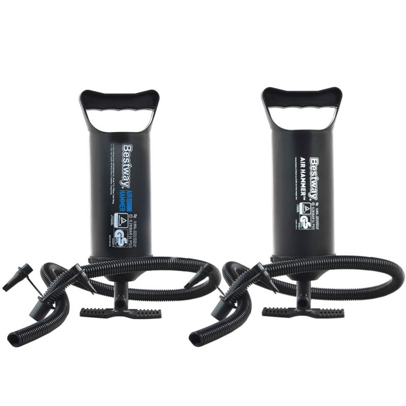 Eine Pumpe mit großer Luftkammer zum schnellen Aufpumpen. Fassungsvermögen 2 x 700 cm3. Die Pumpe ist eine Durchflusspumpe, d. h. sie pumpt während der Auf- und Abbewegung und verfügt über einen flexiblen Schlauch.