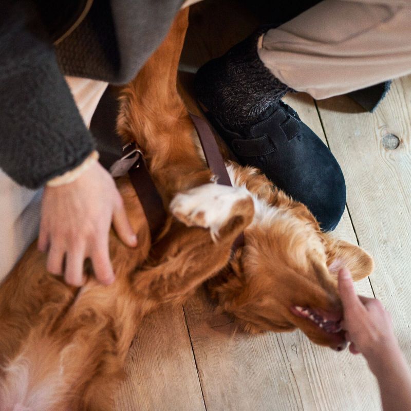 Klassische Leder-Flip-Flops, die hervorragende Qualität, Komfort und elegantes Design vereinen. Sie sind aus Wildleder gefertigt und bieten dank einer Kork-Latex-Innensohle anatomische Unterstützung.