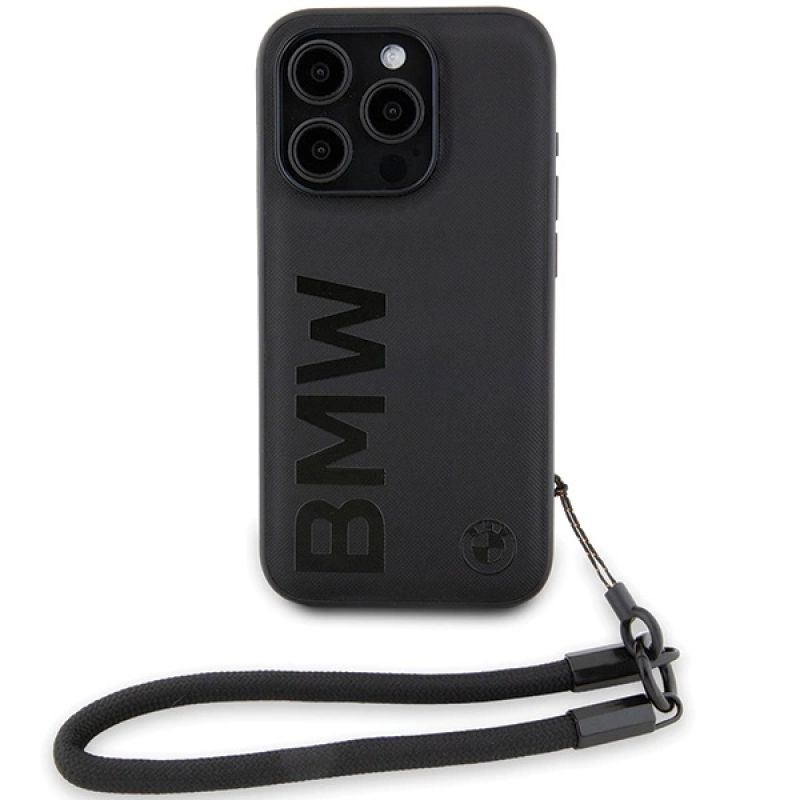 BMW Signature Leder-Wordmark-Cord-Hülle für iPhone 15 Pro – Schwarz