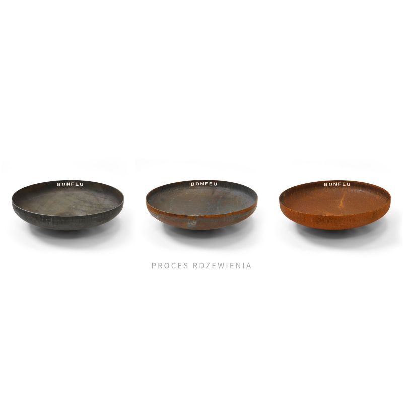 Die BonFeu BonBowl besteht aus hochwertigem, 3 mm starkem Cortenstahl. Corten ist eine witterungsbeständige Metalllegierung aus Eisen mit Zusätzen von Kupfer, Phosphor, Silizium, Nickel und Chrom. Eine rostfarbene, sehr dichte Oxidschicht schützt die tieferen Schichten des Materials vor Sauerstoff und verlangsamt so den Oxidationsprozess deutlich. In Bereichen, in denen sich Wasser in Vertiefungen sammelt, kann es jedoch zu Korrosion kommen.
