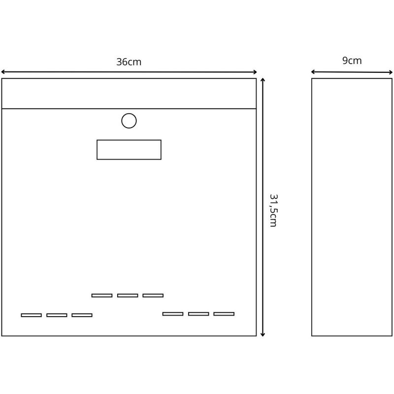 Mit seinen Maßen von 36 x 9 x 31,3 cm bietet der Briefkasten ausreichend Platz für Post, Dokumente und kleine Pakete, sodass Sie ihn nicht ständig leeren müssen. Dank seiner geringen Tiefe (9 cm) benötigt er nur wenig Platz und eignet sich daher ideal für die Wand- oder Zaunmontage. Sein universelles Format ermöglicht die einfache Anpassung an verschiedene Räumlichkeiten und gewährleistet einen bequemen und schnellen Zugriff auf Ihre Post.