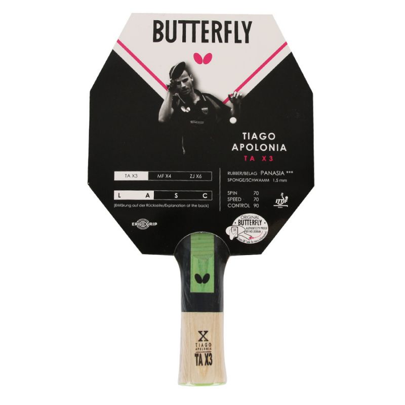 Der Butterfly Tiago Apolonia TAX3-Schläger ist ein hochwertiges Modell für Spieler, die nach der optimalen Balance zwischen Kontrolle, Spin und Geschwindigkeit suchen.