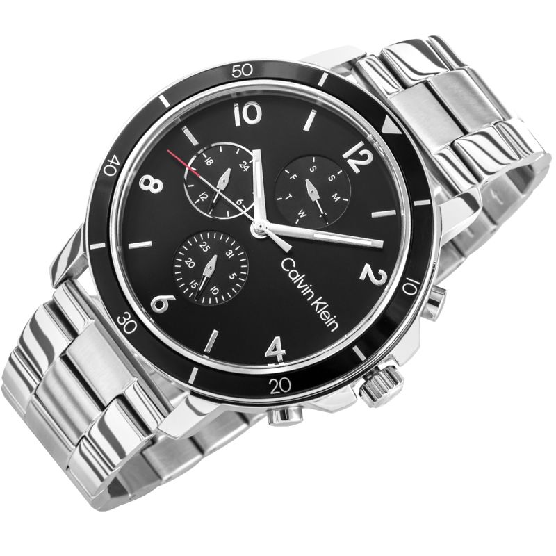 Das CALVIN KLEIN Modell mit schwarzem Zifferblatt ist eine Uhr mit Charakter – frei von unnötigem Schnickschnack, aber mit höchster Präzision. Das tiefe Schwarz des matten Zifferblatts wirkt wie eine Leinwand der Konzentration – absolute Klarheit, pure Funktion. Drei präzise angeordnete Hilfszifferblätter zeigen neben Datum und Wochentag auch eine 24-Stunden-Anzeige an – als wolle die Uhr sagen: „Ich habe alles im Griff, und Sie können es auch.“ Die schwarze Lünette mit ihrer präzise gravierten Skala verleiht der Uhr eine sportliche Note und unterstreicht ihren entschlossenen, maskulinen Charakter. Die rote Spitze des Sekundenzeigers ist ein kleines Detail mit großer Wirkung – sie verleiht dem ansonsten zurückhaltenden Zifferblatt einen Hauch von Wildheit. Sie ist wie ein präziser Akzent, der den Charakter der Uhr unterstreicht und ihr stilvolle Energie verleiht.