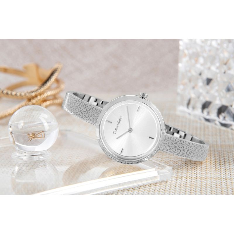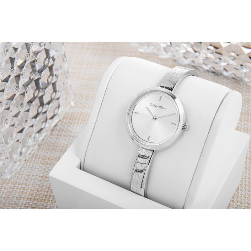 Die CALVIN KLEIN Iconic Uhr verkörpert minimalistische Eleganz und passt perfekt zum Stil der modernen Frau. Ihr Design besticht durch ein dezentes, silberfarbenes Zifferblatt mit Sonnenschliff, das das Licht wunderschön reflektiert und der Uhr einen raffinierten Charakter verleiht. Ein besonderes Merkmal ist das halbstarre Armband mit seiner sanft gerundeten, ovalen Form. Dank seines Designs schmiegt es sich perfekt ans Handgelenk an und verschmilzt beinahe mit ihm – wie ein elegantes Schmuckstück. Die geprägte, strukturierte Oberfläche, verziert mit dem sich wiederholenden „ck Calvin Klein“-Logo, ist ein modisches Detail, das dem Armband einen modernen Designer-Look verleiht und die Uhr von klassischen Modellen abhebt.