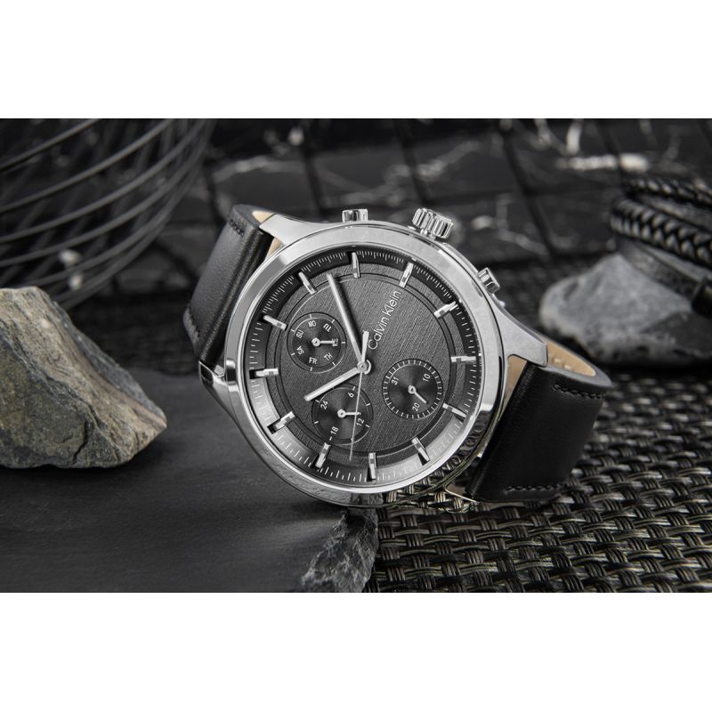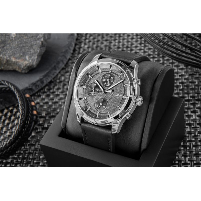 Die CALVIN KLEIN CK ist mehr als nur eine Uhr – sie ist ein Accessoire für den Alltag, ganz im Calvin Klein Stil. In einem eleganten, polierten Edelstahlgehäuse verbergen sich ein präzises Uhrwerk und drei funktionale Hilfszifferblätter: eine 24-Stunden-Anzeige, eine Datumsanzeige und eine Wochentagsanzeige. Alle sind mit höchster Präzision angeordnet, um optimale Ablesbarkeit und Ausgewogenheit zu gewährleisten. Der Sonnenschliff auf dem Zifferblatt lässt die Uhr mit Licht lebendig wirken – er verändert sich je nach Lichteinfall und unterstreicht so ihren modernen, dynamischen Charakter. Das klassische schwarze Lederarmband verleiht Eleganz, ohne die Alltagstauglichkeit einzuschränken. Es ist weich, komfortabel und schmiegt sich wie eine perfekt sitzende Jacke ans Handgelenk. Diese Uhr ist ideal für den Büroalltag und ein Abendmeeting – unaufdringlich und immer stilvoll. Sportlich. Multifunktional. So geht's.