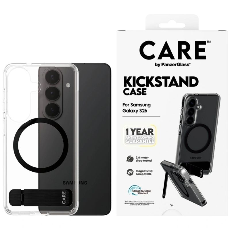 Markieren CARE by PanzerGlass® Bestimmung Samsung Galaxy S26 Material Recycelter Kunststoff Zusätzliche Funktionen Mit Ständer, Qi-fähig, 1 Jahr Garantie gegen Vergilbung, Schutz bis zu 3,6 m Was ist in der Box? Fall| Name | Details |