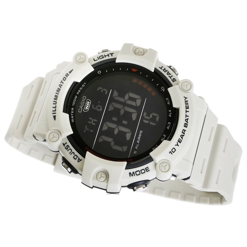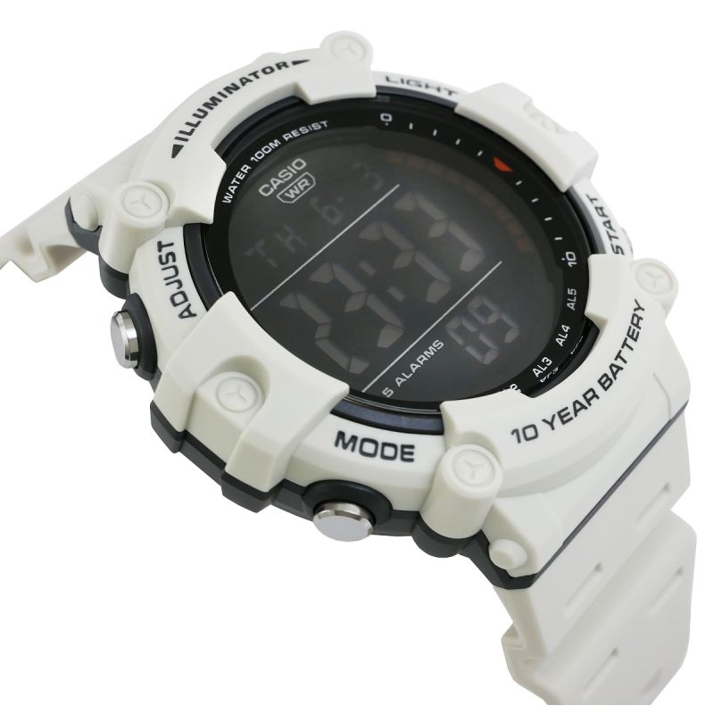 - Zifferblatt: Quarz. Automatischer Kalender: Erweiterte Datumsanzeige mit automatischer Datumsanpassung für kürzere Monate; Timer: Countdown von einer voreingestellten Zeit bis null; 12/24-Stunden-Anzeige; Stoppuhr: 1/100 Sekunde; Dualzeit: 2 Timer-Einstellungen; Alarm: 5 Alarme pro Tag, inklusive Schlummerfunktion und Stundentimer; Beleuchtung: LED-Hintergrundbeleuchtung; Batterielebensdauer: 10 Jahre