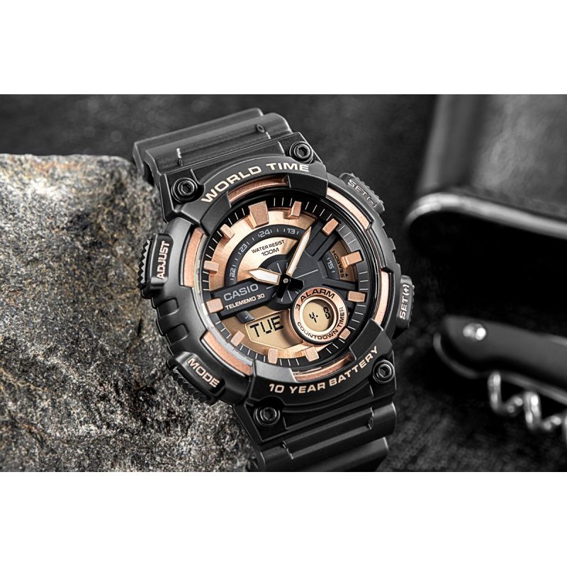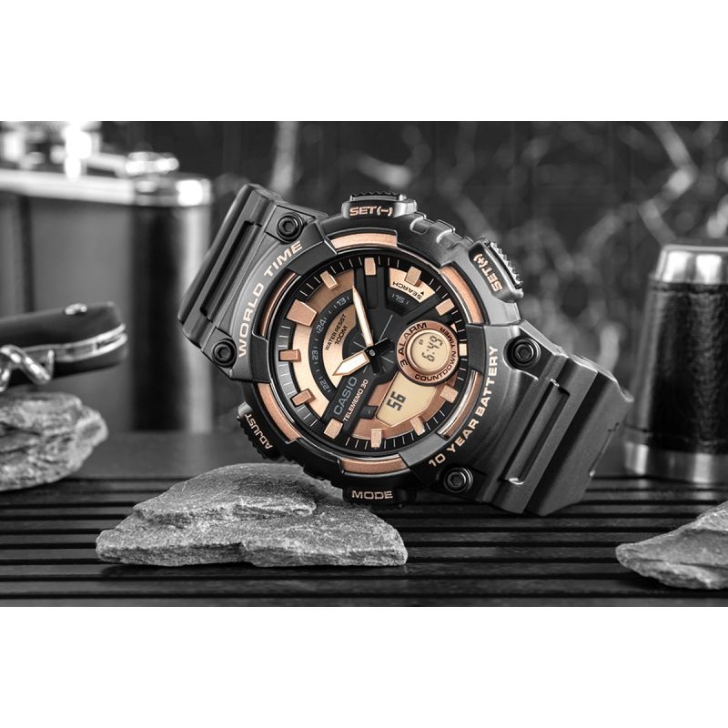Die Casio AEQ-110W mit ihrem markanten 3D-Metallzifferblatt und den kupfergoldenen Akzenten ist der perfekte Begleiter für den Alltag in der Stadt und Outdoor-Abenteuer – egal ob Kurztrip oder Wochenendtrip. Dieses Modell ist unkompliziert und wurde für alle entwickelt, die sich jederzeit und überall auf ihre Ausrüstung verlassen müssen. Sie bietet 10 Jahre zuverlässige Funktion mit nur einer Batterie, ist wasserdicht bis 100 Meter (10 bar) und verfügt über äußerst praktische Funktionen: Weltzeit in 30 Städten (29 Zeitzonen) , eine 1/100-Sekunden- Stoppuhr für besondere Aufgaben, drei Tagesalarme, damit Sie nichts verpassen, und Telememo 30 – so haben Sie wichtige Kontakte immer griffbereit, auch ohne Smartphone. Diese Uhr sieht nicht nur beeindruckend aus – sie ist es auch.