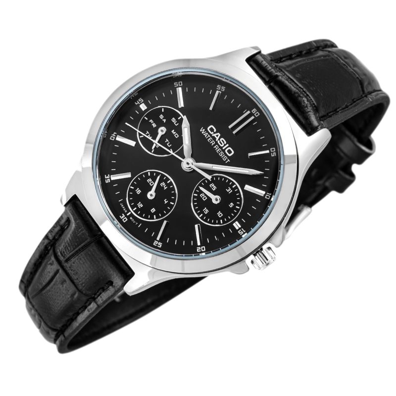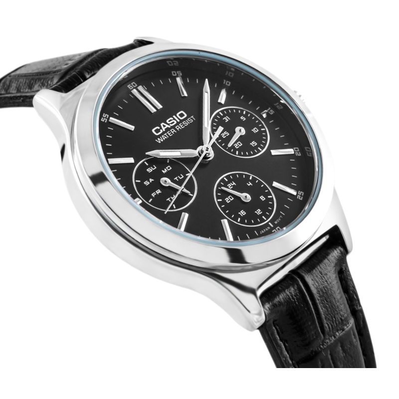 Diese CASIO-Uhr verkörpert Eleganz in ihrer reinsten Form – klassisches Schwarz trifft auf glänzenden Stahl und bildet ein zeitloses Duo, das jeden femininen Stil perfekt ergänzt. Das Zifferblatt mit seiner dezenten Mattierung und den schlanken Indizes strahlt Minimalismus und Raffinesse aus. Drei dezente Hilfszifferblätter zeigen Wochentag, Datum und Uhrzeit im 24-Stunden-Format an und vereinen Charme mit praktischer Funktionalität. Das Lederarmband in Krokodiloptik verleiht der Uhr einen Hauch von Chic und schmiegt sich sanft ans Handgelenk. Diese Uhr ist die perfekte Wahl für Frauen, die klassischen Stil mit einem modernen Touch lieben und Wert auf Funktionalität in einem wunderschönen Design legen.