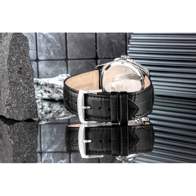 Die Uhr ist mit einem schwarzen Echtlederarmband ausgestattet, das die minimalistische Ästhetik des gesamten Modells perfekt ergänzt. Seine glatte Oberfläche und die sorgfältige Verarbeitung unterstreichen seinen klassischen, zeitlosen Stil und machen sie zur idealen Ergänzung sowohl für den Alltag als auch für formelle Anlässe.