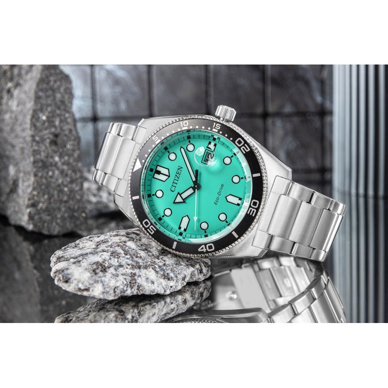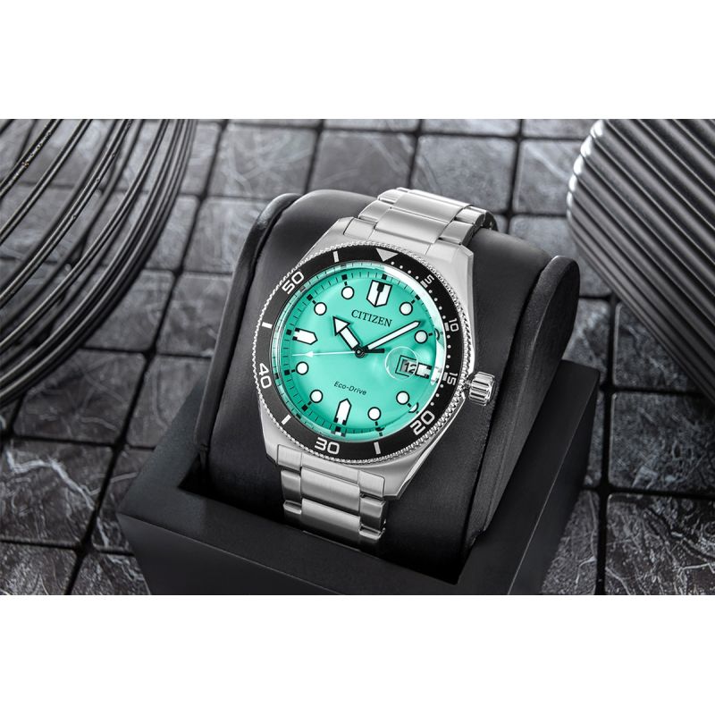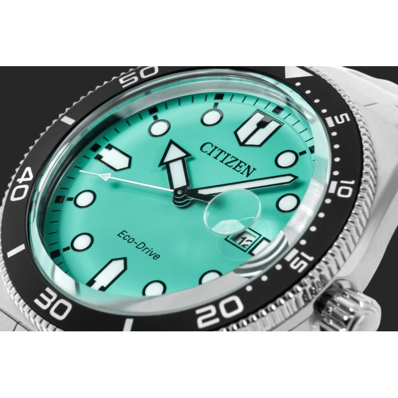 Das markante türkisfarbene Zifferblatt ist ein echter Hingucker und verleiht der Uhr einen frischen, dynamischen Look. Kontrastreiche, gut ablesbare Indizes und massive Zeiger mit fluoreszierender Beschichtung garantieren hervorragende Ablesbarkeit auch bei schwachem Licht. Die Datumsanzeige bei 3 Uhr mit Lupe ermöglicht ein schnelles und einfaches Ablesen des aktuellen Datums.